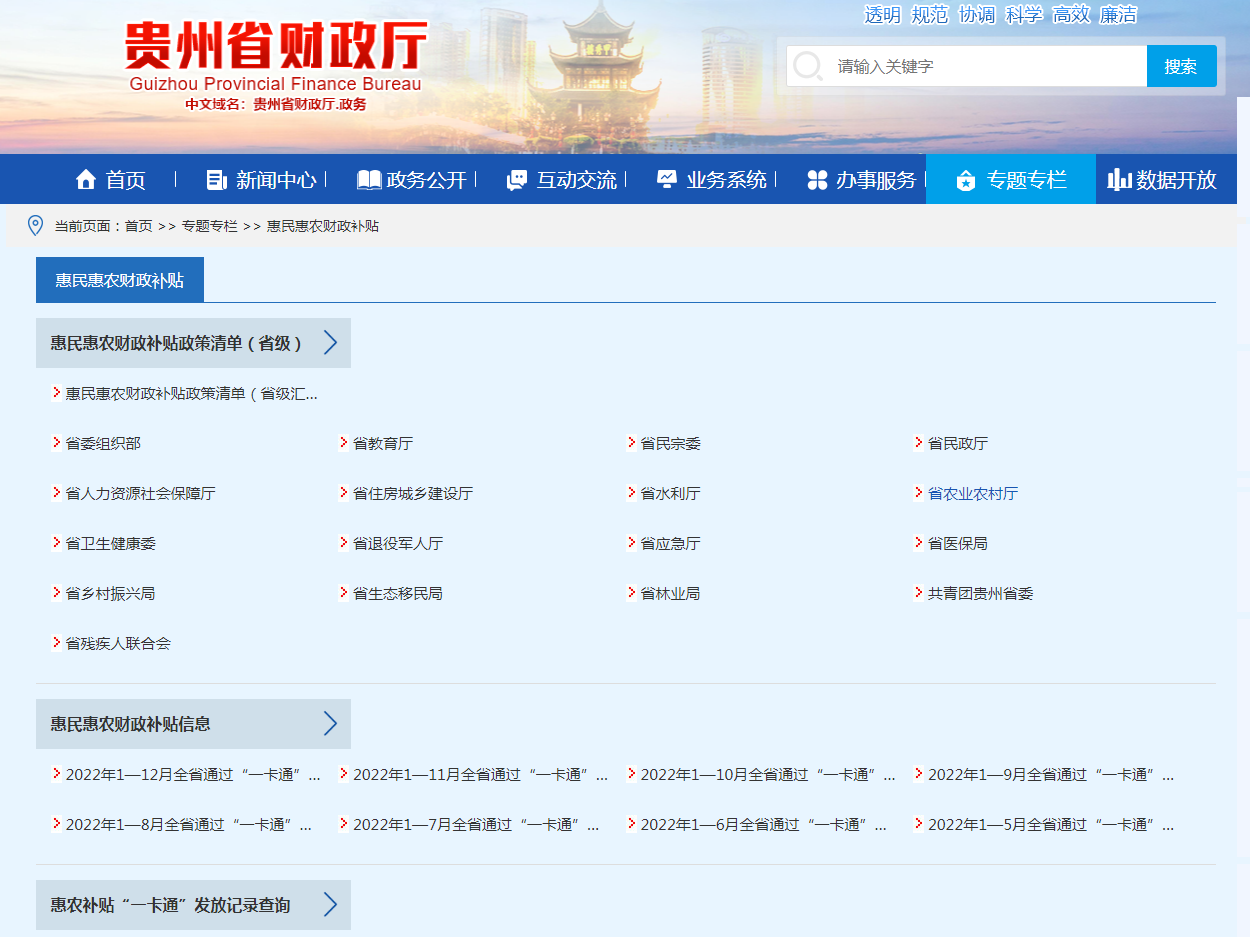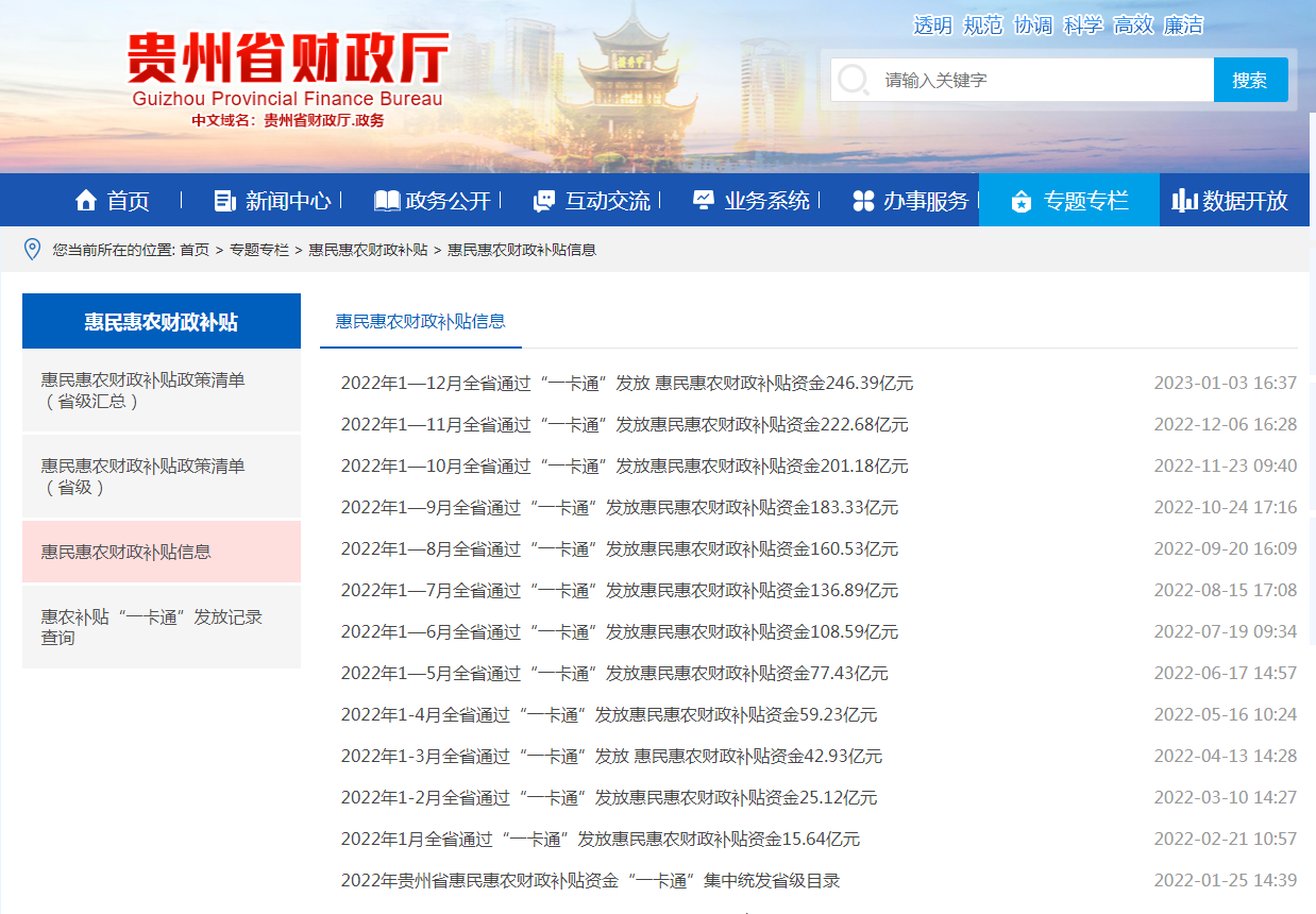 一是加大惠民惠农政策和资金发放信息公开力度。公布2022年省级以上惠民惠农财政补贴政策清单,实现补贴政策名称、文件依据、主管部门、资金用途、补贴对象、补助标准、政策解答电话“七公开”。按月在厅门户网站“惠民惠农财政补贴”专栏公开补贴发放情况,群众还可通过专栏查询本人及所在村组的各项补贴资金发放情况。